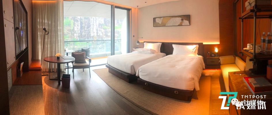 16层的客房中,湖面以上的 14 层为标准客房,每一间都有观景露台,从钛媒体入住的房间望出去,可以看到包围着客房的岩壁景观,还有一侧坑壁落差近百米的瀑布。