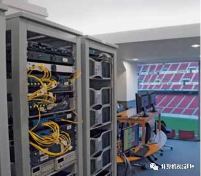 鹰眼系统输入的都是高帧率高清图像,还要合成球运动轨迹,结果要在极短的时间内给出,对计算性能的要求还是很大的。所以看到如下图所示的鹰眼系统控制室里庞大的服务器也没有什么奇怪的了。