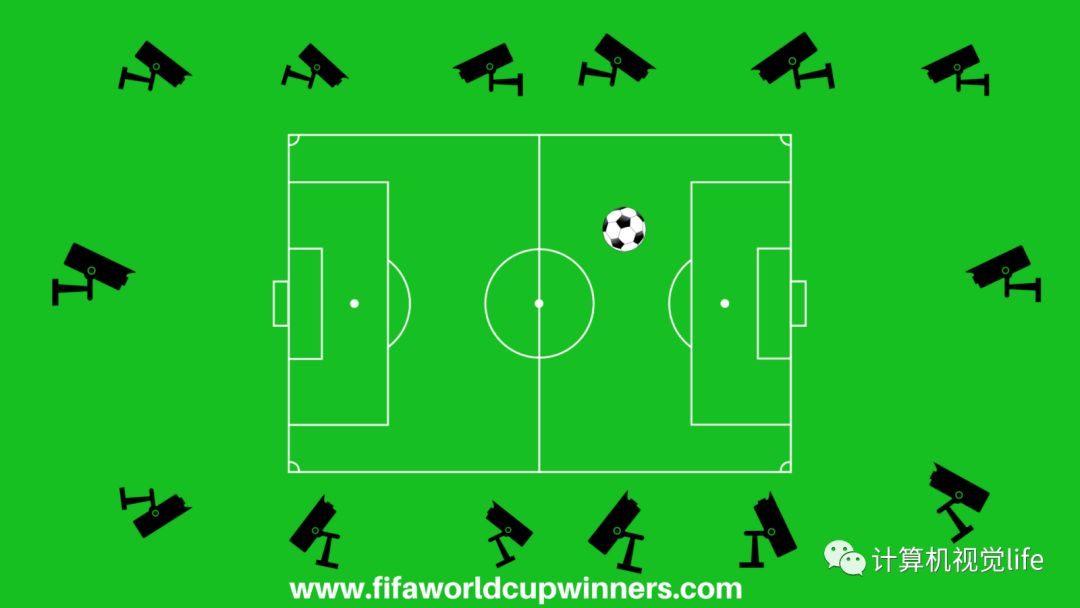 Hawk Eye系统需要在体育场四周不同位置安装14台高速高清摄像机,每7台摄像机关注一个球门。如下图所示。