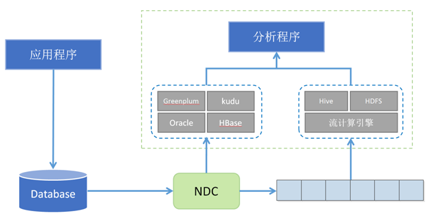 在NDC这样的系统出现后,架构师们有了更加明智的选择:通过NDC实现结构化数据的增量ETL。首先使ETL从小时级延迟降低到秒级,其次NDC的增量数据拉取对源端影响非常小。对直接支持数据更新的OLAP系统而言,可以直接通过NDC实现ETL,如Kudu、HBase。对于不支持数据更新的系统,如Hive,可以通过NDC的数据订阅功能将数据库增量数据发布到消息队列,再定时从消息队列中获取增量数据,并通过MR合并到存量数据,当然这里的定时要比原先定时全量的时间间隔小很多,比如每小时、每15分钟——通过这种方式实现准实时的ETL。