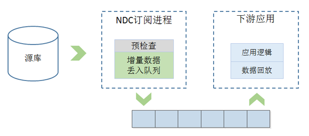 数据订阅任务由NDC的调度服务选择合适的订阅引擎节点执行,与数据迁移增量过程不同的是,数据订阅引擎不会将增量变更数据缓存在本地,而是直接丢入消息队列中(使用了我们的消息队列服务),SDK通过消费消息队列的数据实现增量数据回放。