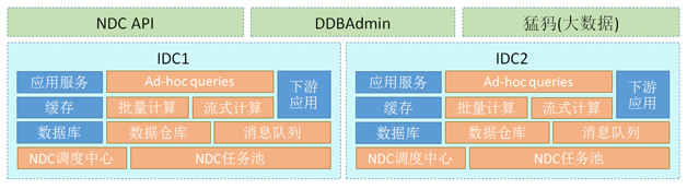 在一个机房内的系统架构中,应用服务无状态,缓存、大数据,这些有状态系统的数据来自于数据库的数据同步和订阅,而数据库的数据除了本机房内应用产生外,也可以来自NDC从其他机房的数据同步。从这套架构中可以看出,通过NDC同步机房间的数据库数据,再由NDC将数据库的变更同步到大数据、缓存、消息队列,由此驱动业务在机房间无缝扩展和冗余。