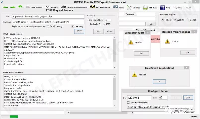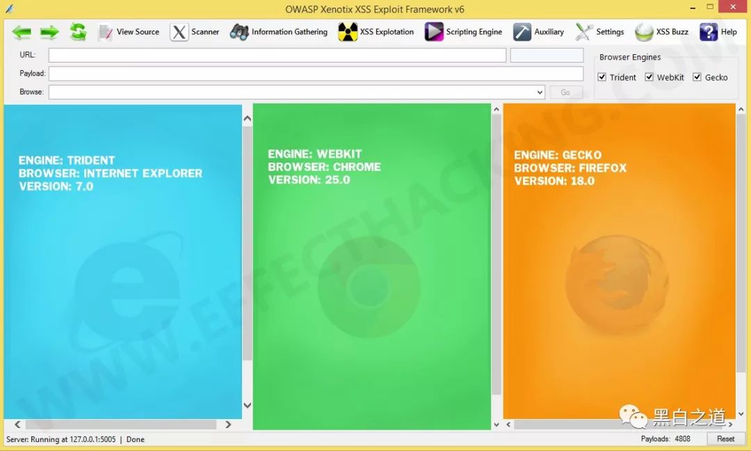 Xenotix是一个先进的开源Cross Site Scripting(XSS)漏洞检测和利用框架。它利用其独特的三重浏览器引擎(Trident,WebKit和Gecko)嵌入式扫描仪提供零假正扫描结果