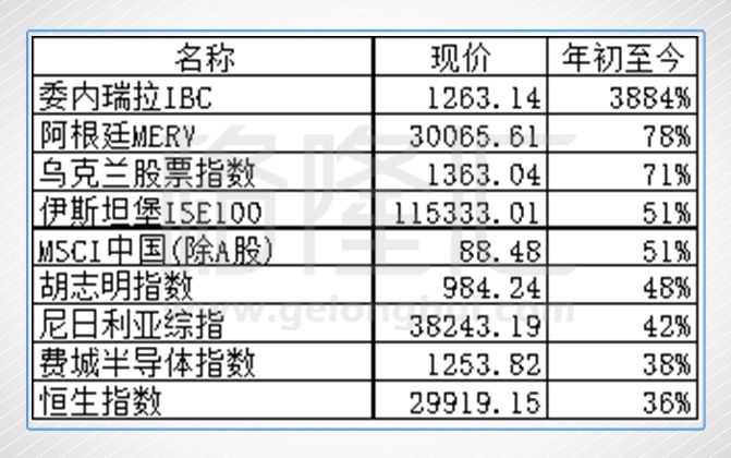 2017涨的最多的是委内瑞拉IBC指数,全年上涨38倍。而如果我们去复盘2016,发现同样是委内瑞拉指数涨幅全球第一。当然这并不是他们的经济有多好,反而是他们的经济已经坏到了让人无法相信的地步,指数大涨38倍的背后是令人夸张的货币贬值。