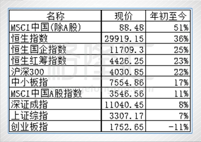 在全球各种指数中,排名前面的还有阿根廷,乌克兰和伊斯坦堡的指数,当然这些都不是全球主流指数,所以我也懒得看具体原因。让我惊喜的是,MSCI中国(除A股)指数和恒生指数都上榜全球前十,可喜可贺。