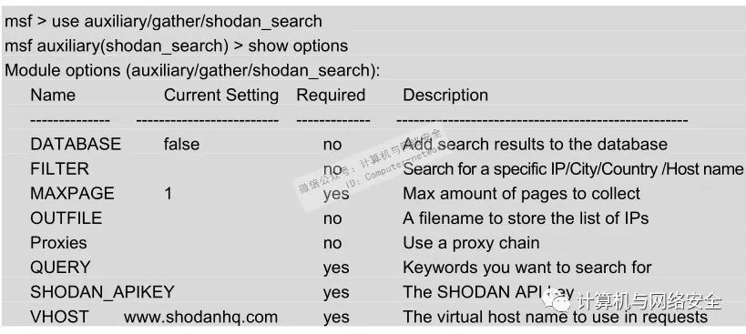 (6)选择auxiliary/gather/shodan_search模块,并查看该模块下可配置的选项参数。执行命令如下所示: