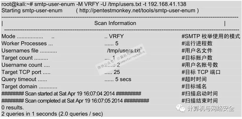 smtp-user-enum是针对SMTP服务器的25端口,进行用户名枚举的工具,用以探测服务器已存在的邮箱账户。在SMTP服务上启动用户的SMTP枚举。执行命令如下所示: