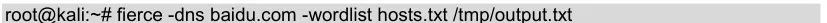 fierce工具和DNSenum工具性质差不多,其fierce主要是对子域名进行扫描和收集信息的。使用fierce工具获取一个目标主机上所有IP地址和主机信息。执行命令如下所示: