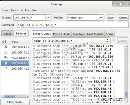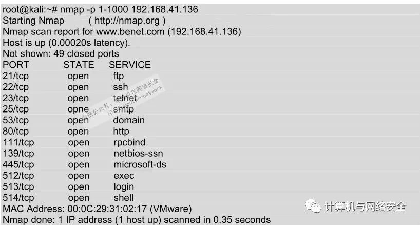 输出信息显示了192.168.41.138主机打开的端口。如21、25、80和443,总共打开了4个端口号。
