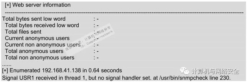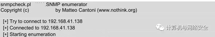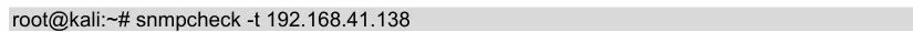 Snmpcheck工具允许用户枚举SNMP设备的同时将结果以可读的方式输出。下面演示该工具的使用。使用Snmpcheck工具通过SNMP协议获取192.168.41.138主机信息。执行命令如下所示: