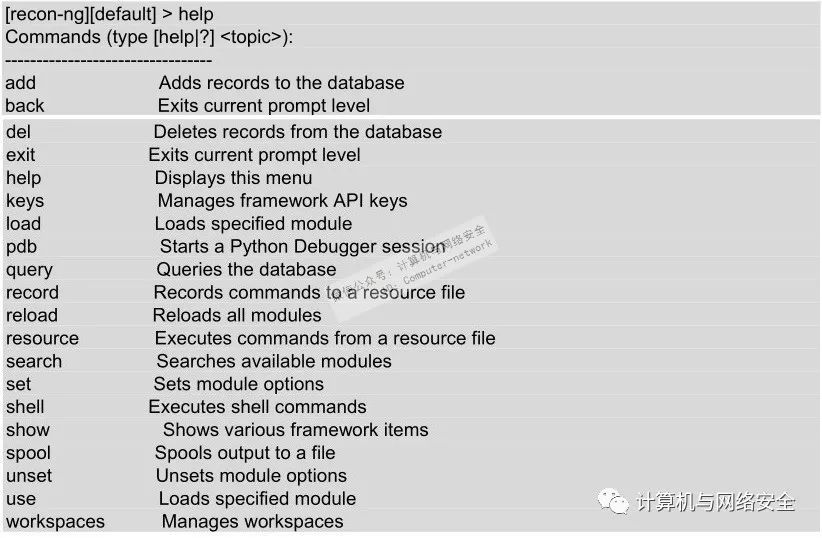 首次使用Recon-NG框架之前,可以使用help命令查看所有可执行的命令。如下所示: