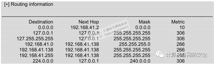 以上信息表示目标系统的一个路由表信息。该路由表包括目的地址、下一跳地址、子网掩码及路径长度值。