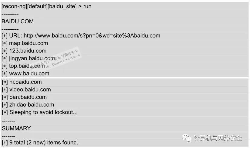 (1)使用recon/domains-hosts/baidu_site模块。执行命令如下所示: