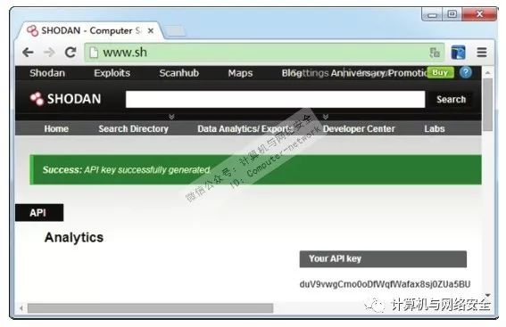 (2)从http://www.shodanhq.com/api_doc网站获取API key,获取界面如图8所示。获取API key,为了在后面使用。