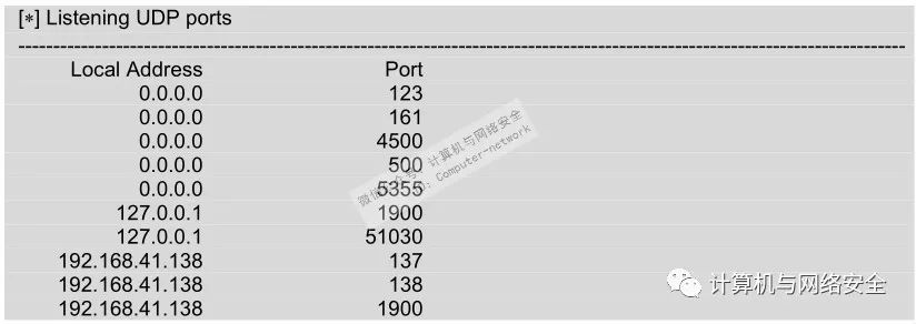 (11)获取监听UDP端口信息,如监听的UDP端口有123、161、4500、500和5355等。结果如下所示: