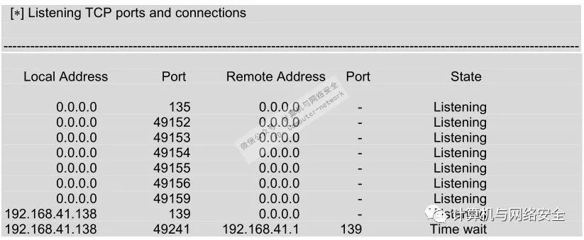 (10)获取监听的TCP端口,如监听的TCP端口号有135、495149513和139等。结果如下所示: