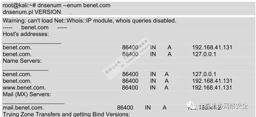 DNSenum是一款非常强大的域名信息收集工具。它能够通过谷歌或者字典文件猜测可能存在的域名,并对一个网段进行反向查询。它不仅可以查询网站的主机地址信息、域名服务器和邮件交换记录,还可以在域名服务器上执行axfr请求,然后通过谷歌脚本得到扩展域名信息,提取子域名并查询,最后计算C类地址并执行whois查询,执行反向查询,把地址段写入文件。下面介绍使用DNSenum工具检查DNS枚举。在终端执行如下所示的命令: