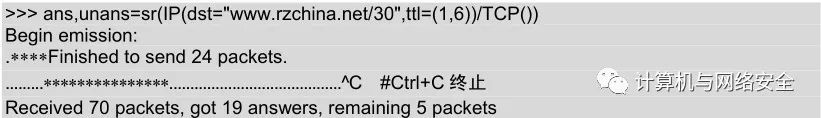 执行以上命令后,会自动与 www.rzchina.net 建立连接。执行几分钟后,使用 Ctrl+C终止接收数据包。从输出的信息中可以看到收到70个数据包,得到19个响应包及保留了5个包。