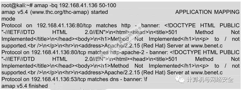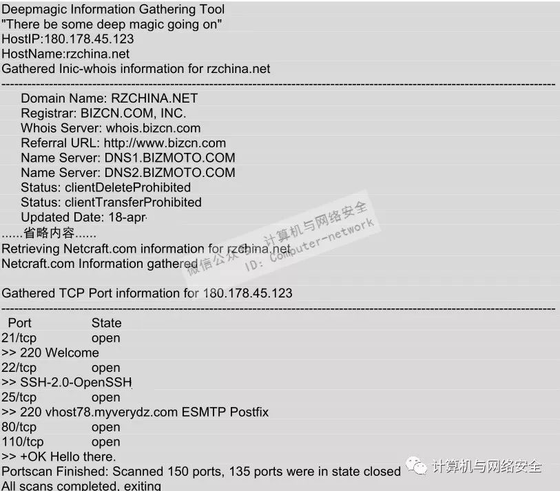 输出的信息显示了rzchina.net域名的IP地址、WHOIS信息及开放的端口号等。执行以上命令后输出的信息很多,但是由于篇幅的原因,部分内容使用省略号(......)代替。