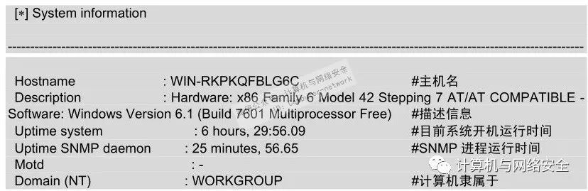 从输出的信息中可以看到该系统的主机名为 WIN-RKPKQFBLG6C、x86架构和Windows系统等信息。