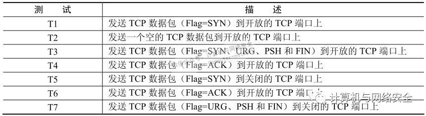 Nmap使用TCP/IP协议栈指纹准确地判断目标主机的操作系统类型。首先,Nmap通过对目标主机进行端口扫描,找出有哪些端口正在目标主机上监听。当侦测到目标主机上有多于一个开放的TCP端口、一个关闭的TCP端口和一个关闭的UDP端口时,Nmap的探测能力是最好的。Nmap工具的工作原理如表1所示。