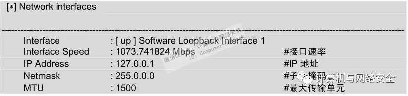(7)获取网络接口信息,如接口状态、速率、IP地址和子网掩码等。结果如下所示: