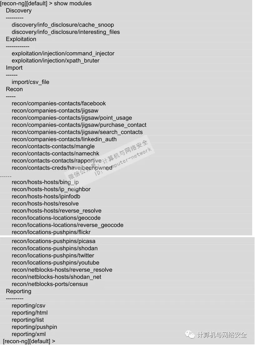以上输出信息显示了在 Recon-NG 框架中可运行的命令。该框架和Metasploit 框架类似,同样也支持很多模块。此时,可以使用show modules命令查看所有有效的模块列表。执行命令如下所示: