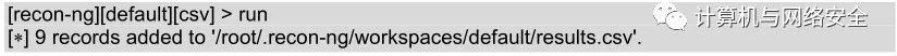 从输出的信息中可以看到,枚举到的9个记录已被添加到/root/.recon-ng/workspaces/default/results.csv文件中。打开该文件,如图4所示。
