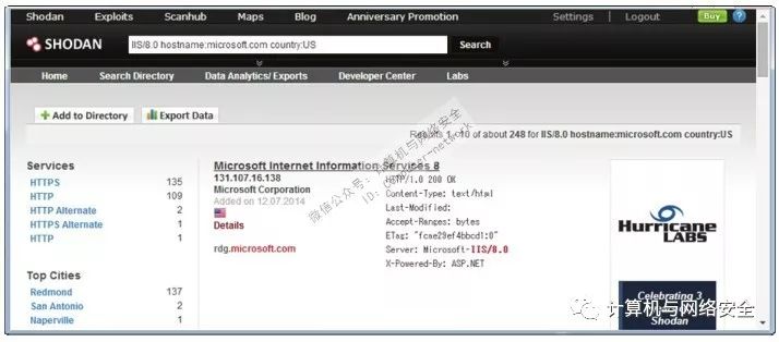 在使用 Shodan 搜索引擎中,可以使用过滤器通过缩小搜索范围快速的查询需要的东西。如查找运行在美国IIS 8.0的所有IIS服务,可以使用以下搜索方法,如图7所示。