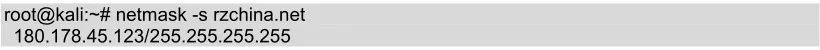 虽然使用DMitry工具可以查看到IP或域名信息,但还是不能判断出这个网络范围。因为一般的路由器和防火墙等并不支持IP地址范围的方式,所以工作中经常要把IP地址转换成子网掩码的格式、CIDR格式和思科反向子网掩码格式等。在Linux中,netmask工具可以在IP范围、子网掩码、CIDR和Cisco等格式中互相转换,并且提供了IP地址的点分十进制、十六进制、八进制和二进制之间的互相转换。使用netmask工具将域名rzchina.net转换成标准的子网掩码格式。执行命令如下所示: