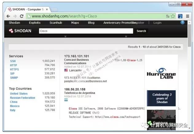 从该界面可以看到搜索到全球三百多万的 Cisco 路由器。在该界面用户可以单击任何IP地址,直接找到该设备。