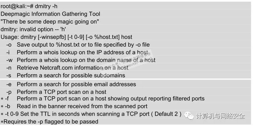 查看Dmitry命令的帮助信息。执行命令如下所示: