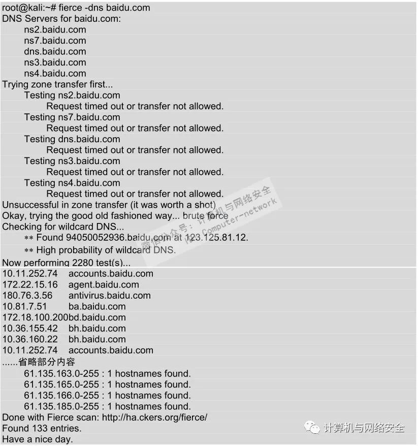 输出的信息显示了 baidu.com 下所有的子域。从倒数第2行,可以看到总共找到133个条目。执行以上命令后,输出的内容较多。但是由于篇幅的原因,部分内容使用省略号(......)取代。