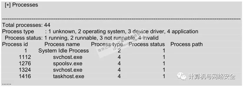 输出信息的第一行表示该系统中共有44个进程。由于篇幅的原因,这里只列出了前几个运行的进程。第二行指定了进程类型:1表示不知名;2表示操作系统;3表示设备驱动;4表示应用程序。第三行指定了进程的状态:1表示正在运行;2表示可以运行;3表示不能运行;4表示无效的。第四行的内容是以列的形式显示:第一列表示进程ID;第二列表示进程名;第三列表示进程状态;第四列表示进程路径。
