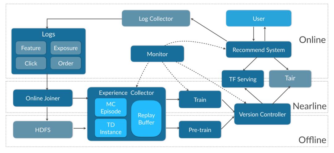 强化学习通常是在一次次试错(Trial-and-Error)中学习,实时地改进策略并获得反馈能大幅提升学习效率,尤其在连续策略中。这一点在游戏场景下很容易理解,相应地,我们也在推荐系统中构建了实时深度学习系统,让策略更新更加高效。为了支持实时更新的DRL模型和高效实验,我们针对Online Learning需求基于TensorFlow及TF Serving的一些改进和优化,设计并实现了一套特征配置化的实时更新的DRL框架,在实验迭代过程中沉淀了DQN、DDQN、DDPG、A3C、A2C、PPO[8]等模型。系统架构如图所示:
