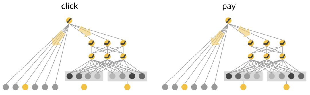 “猜你喜欢”目前使用的排序模型由两个同构的Wide&Deep模型组成,分别以点击和支付作为目标训练,最后把两个模型的输出做融合。融合方法如下图所示: