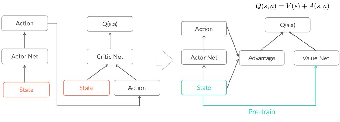 借鉴DDQN[5]的优势函数Advantage的思路,我们把critic估计的Q(s,a)拆分成两个部分:只与状态相关的V(s),与状态、动作都相关的Advantage函数A(s,a),有Q(s,a) = V(s) + A(s,a),这样能够缓解critic对Q过高估计的问题。具体到推荐环境中,我们的策略只是对排序模型的融合参数做调整,收益主要是由状态决定的。