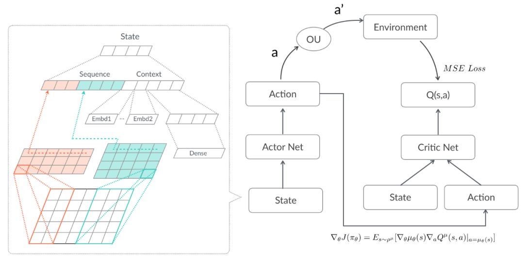 如上图所示,基本的DDPG是Actor-Critic架构。线上使用Actor网络,预测当前State下最好的动作a,并通过Ornstein-Uhlenbeck过程对预测的Action加一个随机噪声得到a',从而达到在最优策略附近探索的目的。将a' 作用于线上,并从用户(Environment)获得相应的收益。训练过程中,Critic学习估计当前状态s下采取动作a获得的收益,使用MSE作为Loss Function:
