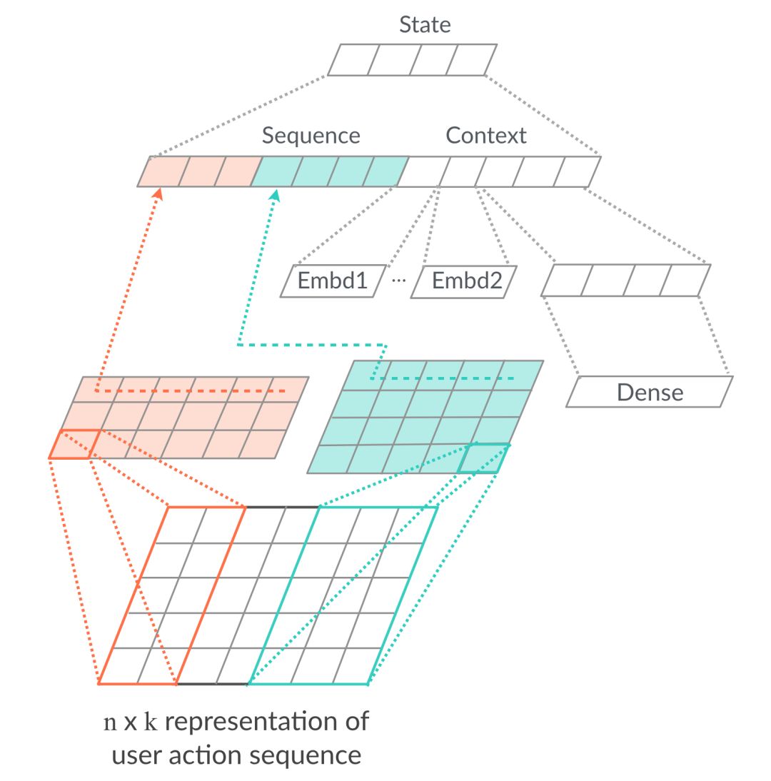 状态来自于Agent对Environment的观察,在推荐场景下即用户的意图和所处场景,我们设计了下图所示的网络结构来提取状态的表达。网络主要分为两个部分:把用户实时行为序列的Item Embedding作为输入,使用一维CNN学习用户实时意图的表达;推荐场景其实仍然相当依赖传统特征工程,因此我们使用Dense和Embedding特征表达用户所处的时间、地点、场景,以及更长时间周期内用户行为习惯的挖掘。
