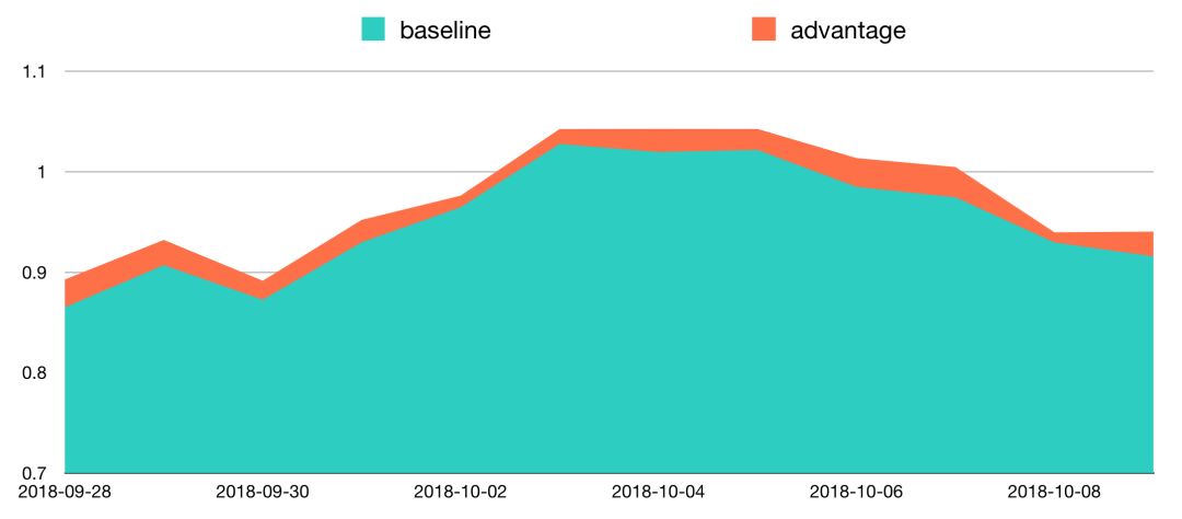 在DDPG的改造工作中,我们使用Advantage函数获得更稳定的训练过程和策略梯度。State权值共享和On-Policy方法使我们的模型参数减少75%。Advantage函数和State权值共享结合,允许我们使用基线策略样本做数据增强,使每天的训练样本从十万量级扩展到百万量级,同时充分的预训练保证策略上线后能迅速收敛。经过这些努力,强化学习线上实验取得了稳定的正向效果,在下单率效果持平的情况下,周效果点击率相对提升0.5%,平均停留时长相对提升0.3%,浏览深度相对提升0.3%。修改过的模型与A2C的主要区别是我们仍然使用确定性策略梯度,这样我们可以少估计一个动作的分布,即随机策略方差降至0的特例。上图表明强化实习的效果是稳定的,由于“猜你喜欢”的排序模型已经是业界领先的流式DNN模型,我们认为这个提升是较为显著的。