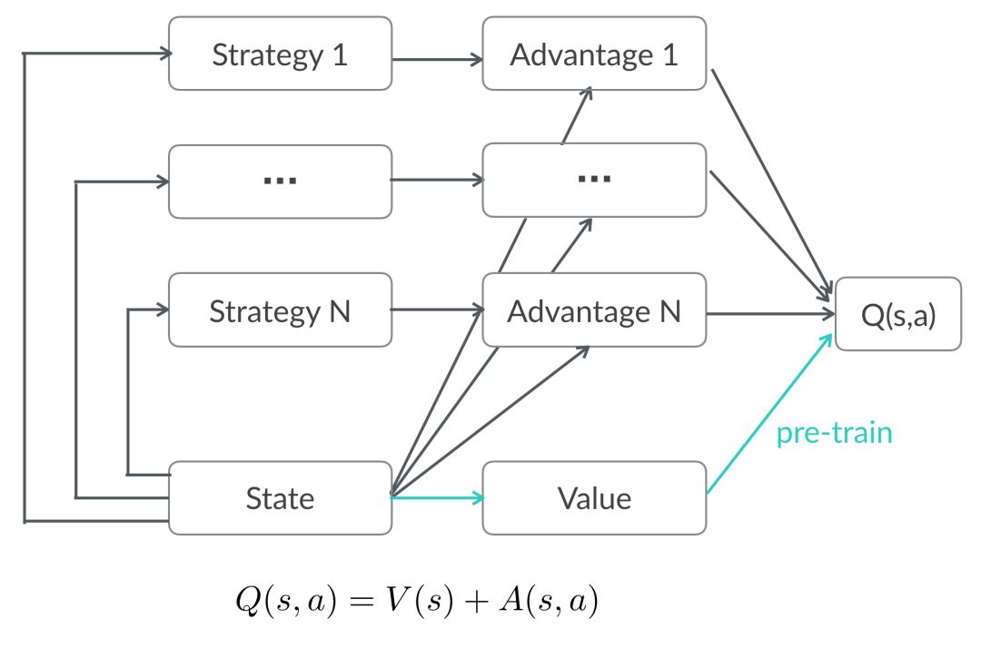 如图所示,线上多组实验共享State表达和V(s)的估计,每个策略训练自己的A(s,a)网络且能快速收敛,这样的结构一方面使训练过程更加稳定,另一方面为强化学习策略全量提供了可能性。