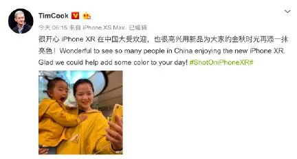 今天,苹果CEO库克,在微博发文称,很高兴iPhone XR在中国大受欢迎。