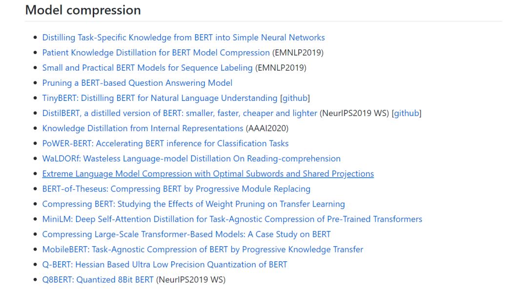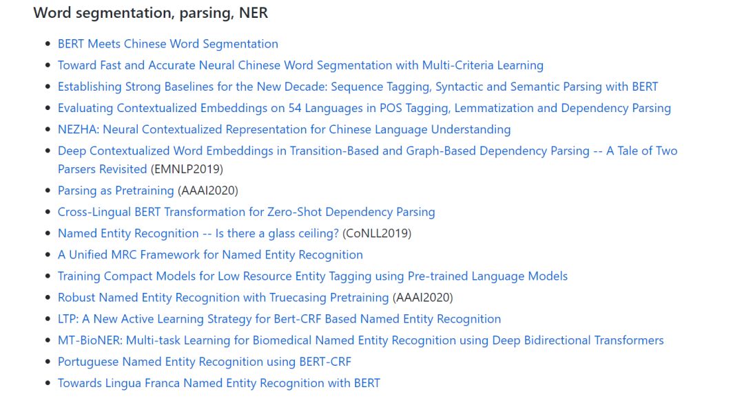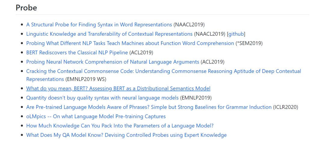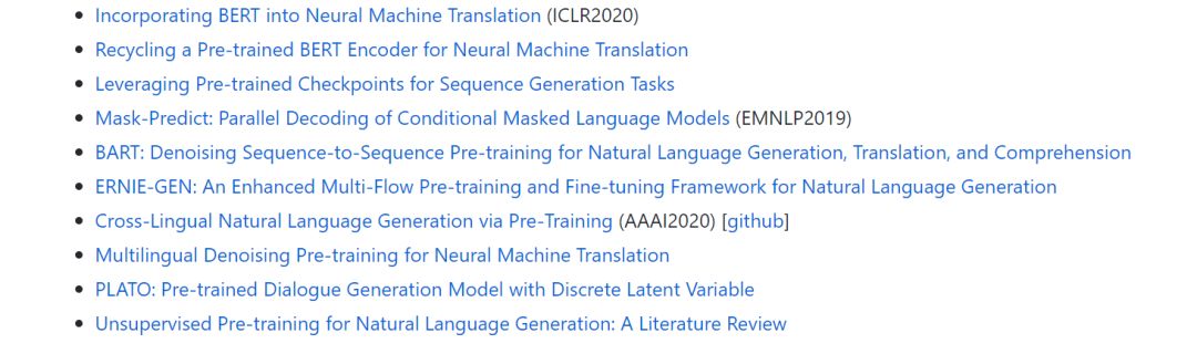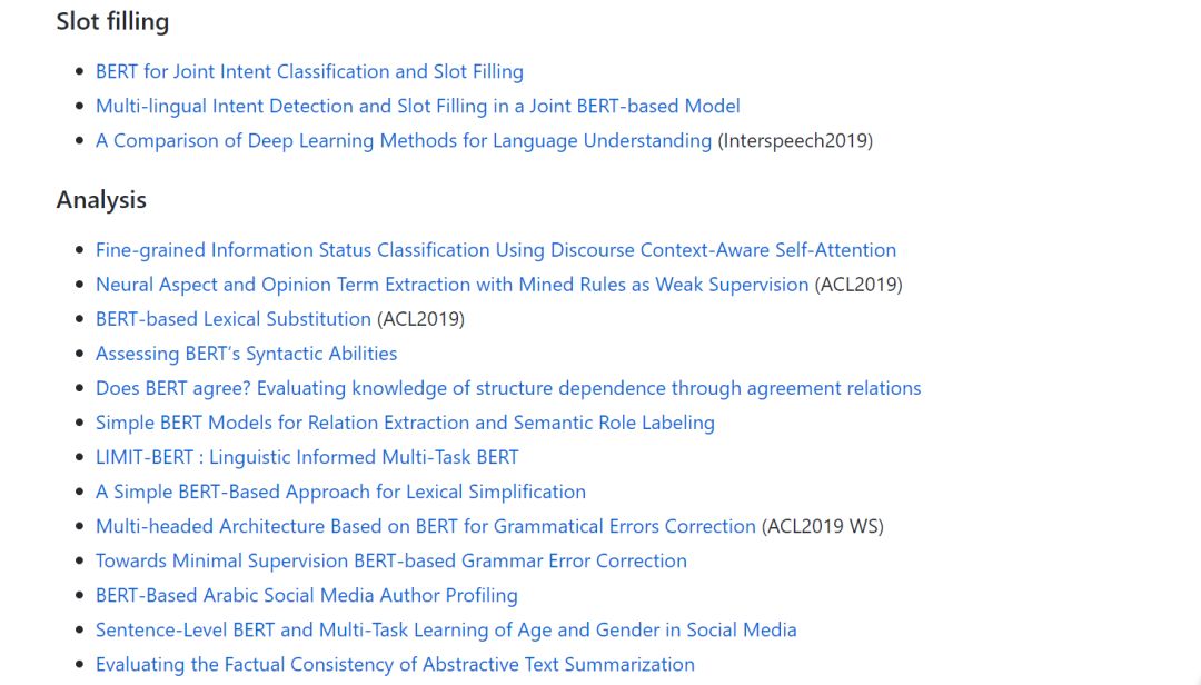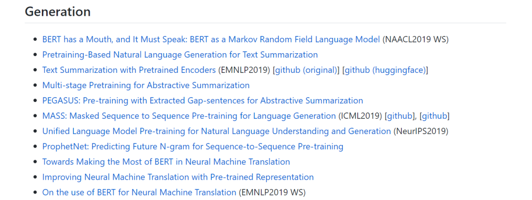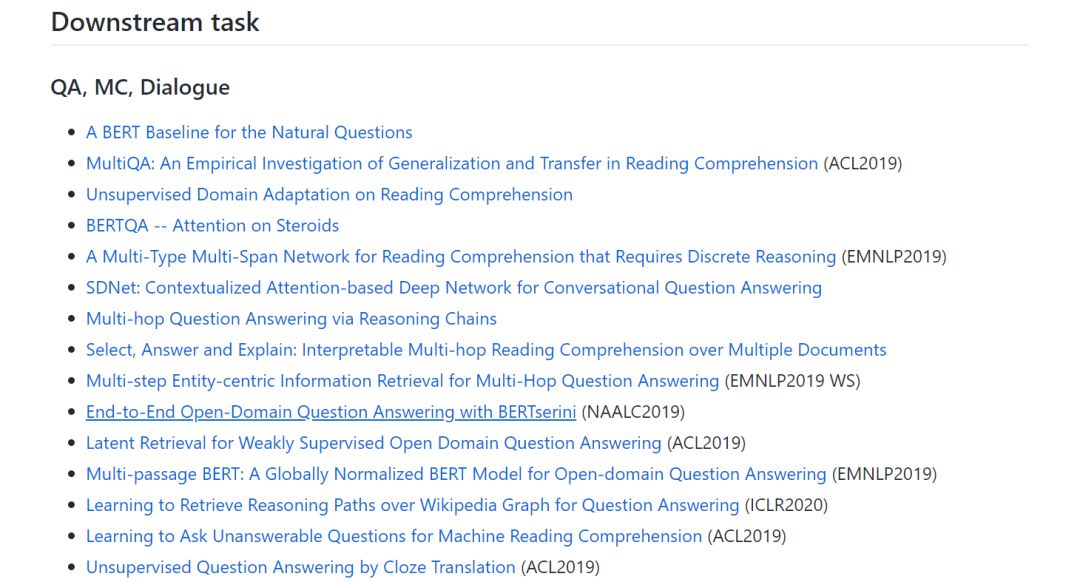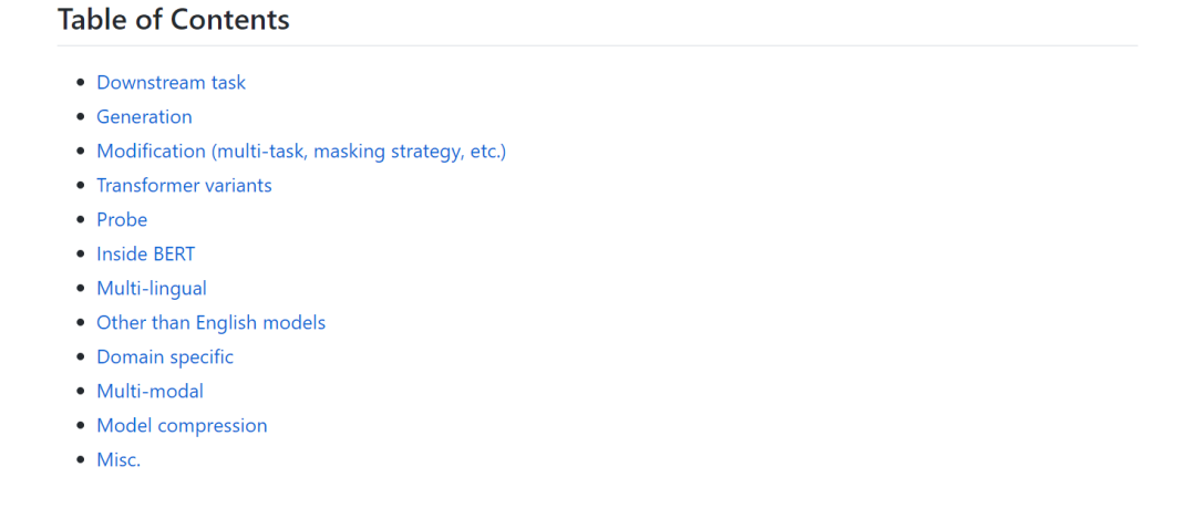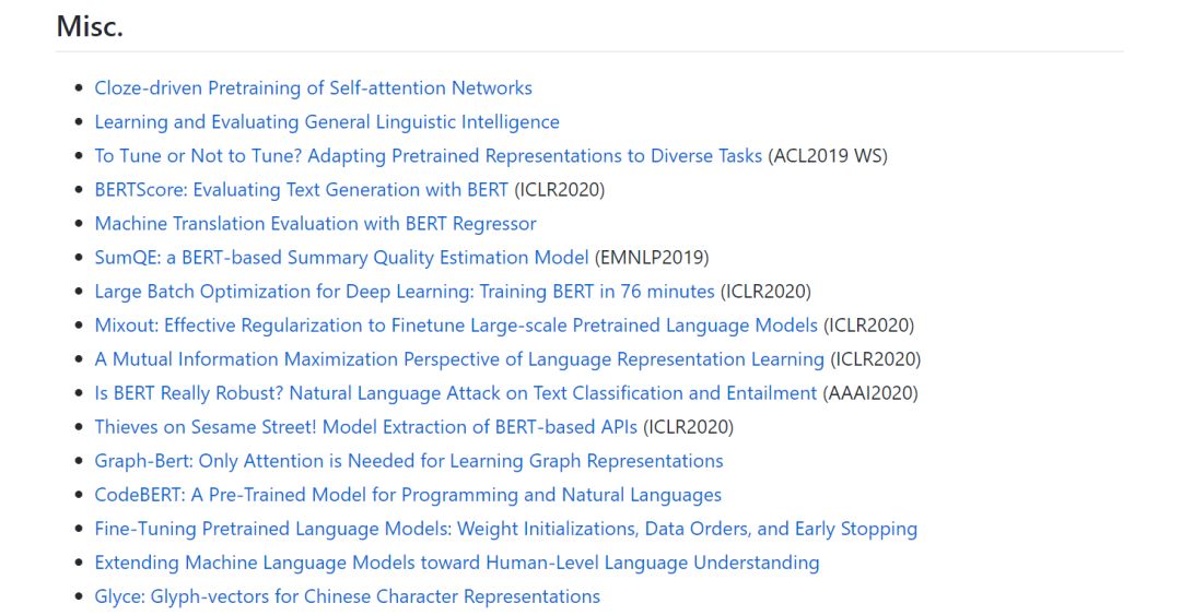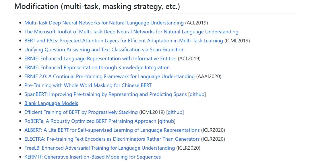 本资源整理了与BERT相关的论文,并按应用类别进行分类,包括:Downstream task、Generation、Modification (multi-task, masking strategy, etc.)、Transformer variants、Probe、Inside BERT、Multi-lingual(多语言)、Other than English models(英语以外的模型)、Domain specific(特定领域)、Multi-modal(多模态)、Model compression(模型压缩)、Misc(其他混杂论文)。