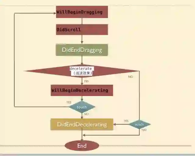 deceleratingreturns:returns YES if user isn't dragging (touch up) but scroll view is still moving可以理解为用户手已放开,试图是否还在滚动(是否惯性效果)