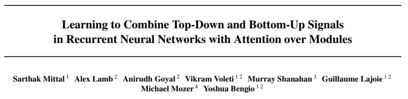 Bengio提到的发表在ICML2020的论文是《Learning to Combine Top-Down and Bottom-Up Signals in Recurrent Neural Networks with Attention over Modules》,感兴趣的同学可以去看看: