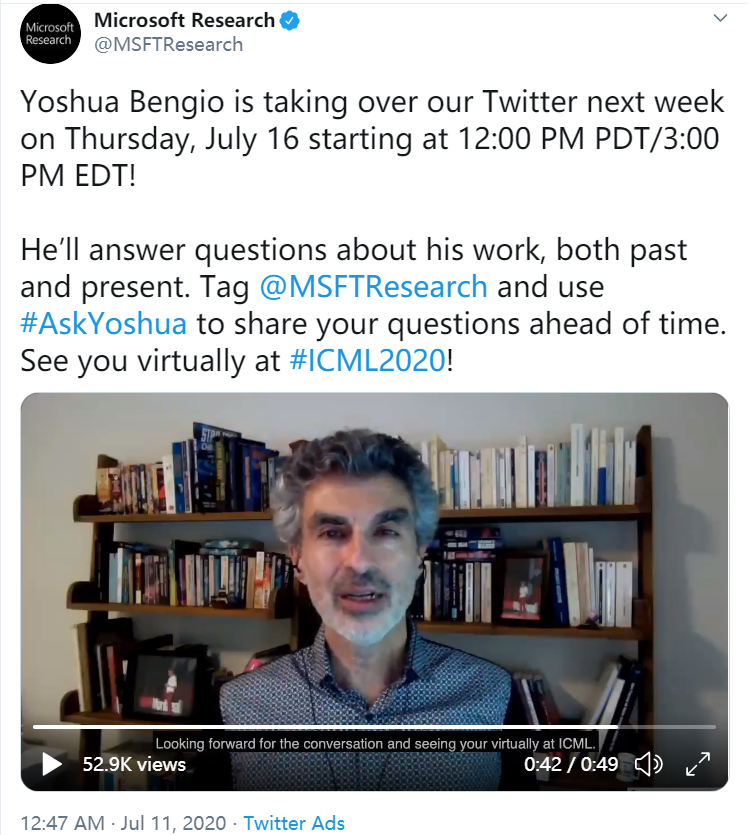 早在7月11日,Bengio就在微软研究院的官方Twitter上发布了一个视频,表示会在7月16日与网友进行问答互动。Bengio在视频中说,可以就他的研究工作提任何问题,并特别提到他发表在ICML2020的一项工作。