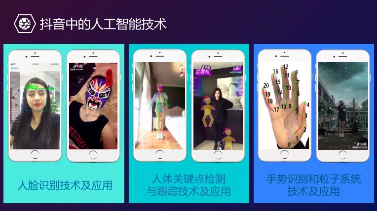 台下如果有熟悉抖音的来宾,应该会对抖音的各种特效、滤镜、创意玩法印象深刻。可以说这些正是这款产品制胜的关键原因之一。而它们都是 AI 技术在短视频中的应用。
