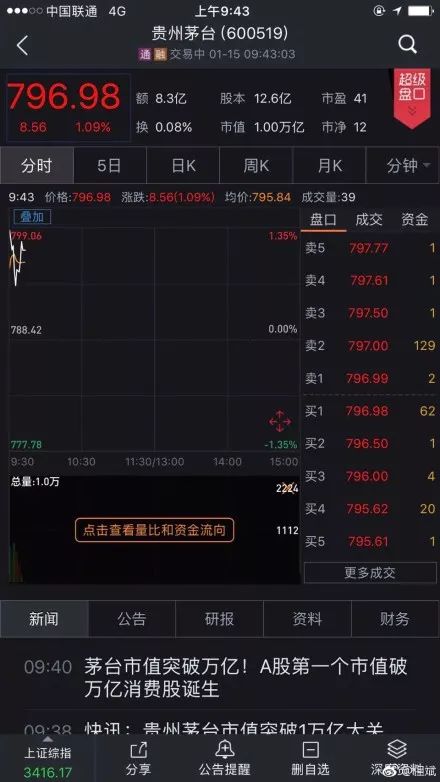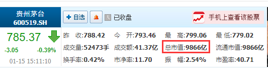 茅台在昨天(1月15日)盘中市值突值终于1万亿大关,成为A股第一个市值突破万亿的消费股。