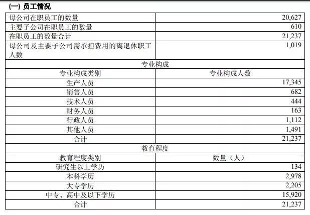 而据2016年年报,茅台在职员工总数为21237人。且近75%的在职员工的教育程度为中专、高中及以下学历。