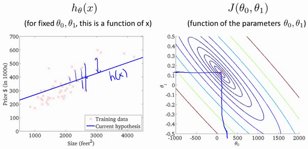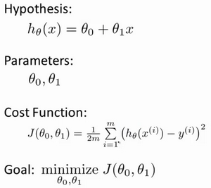 我们使用线性回归算法来预测,所以取假设函数 Hypothesis 的表达式为 2 个参数(theta_0,theta_1)线性函数。